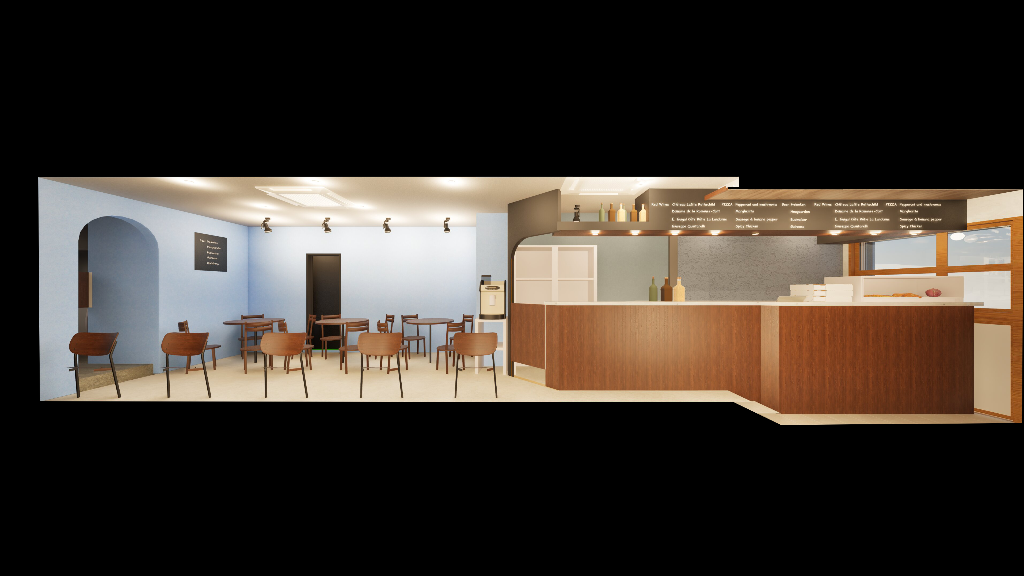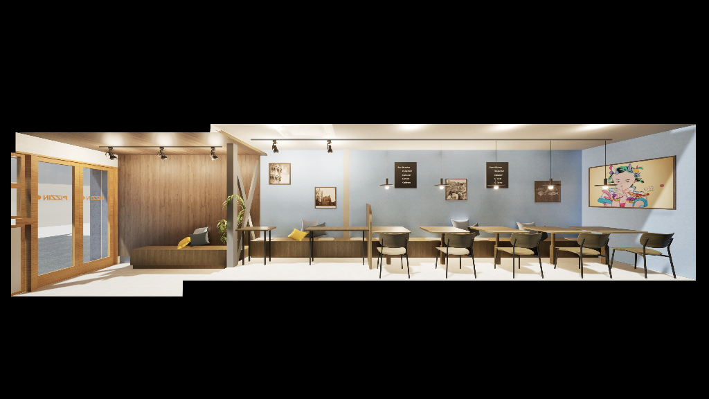 その中で、ピザを中心とした気軽に立ち寄りやすい業態づくり、テイクアウトに対応した入口計画、限られた面積の中での客席・厨房レイアウト、既存テナント改修ならではの工事上の調整など、さまざまなテーマに向き合いながら設計を進めています。