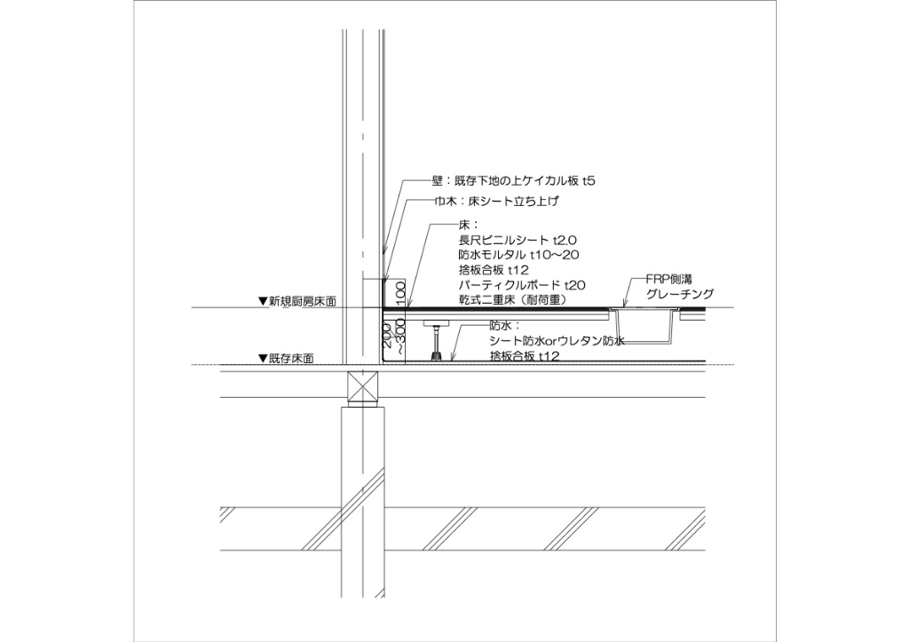 - 床に水を流すため**防水施工が必須**